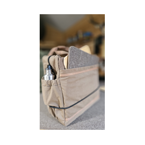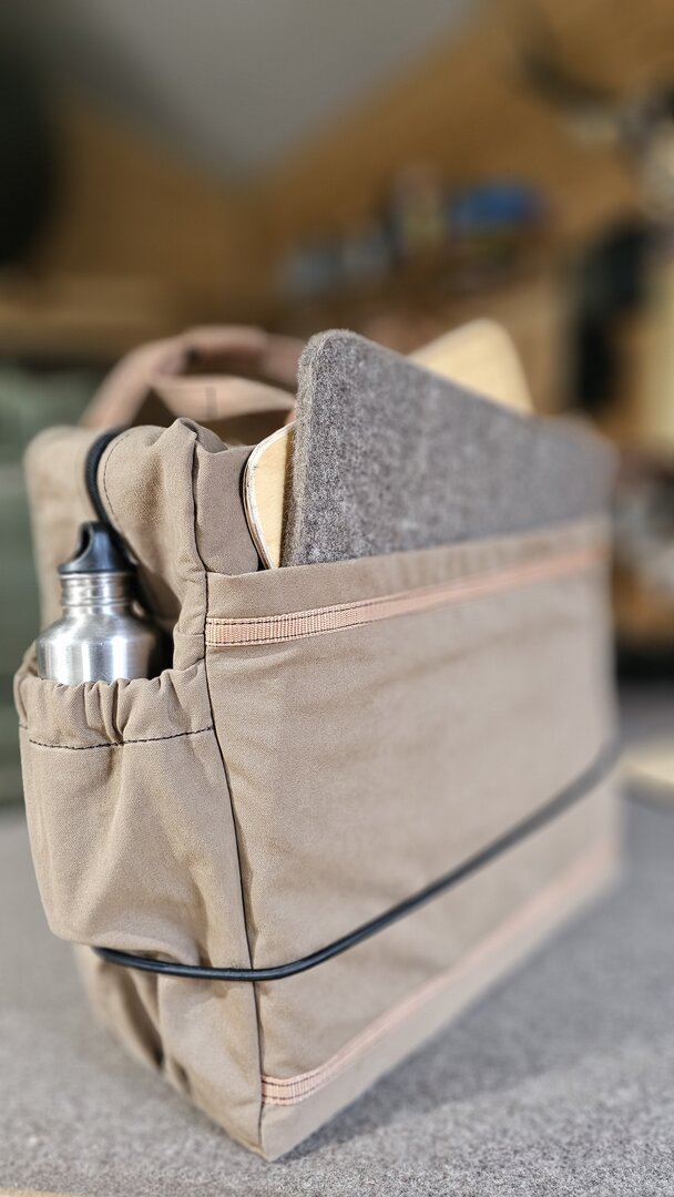 An der Vorderseite befindet sich ein großes Einsteckfach, in dem Gegenstände wie ein dünnes Brett als Tischersatz, Sitzkissen aus Filz, Kartenmaterial oder andere flache Gegenstände Platz finden. Auf der einen Seite befindet sich eine Raff- Tasche (Aufsetztasche mit Gummizug), um schnellen Zugriff z.B. auf eine Trinkflasche oder andere wichtige Ausrüstungsgegenstände zu haben. Auf der anderen Seite befindet sich eine Reißverschlusstasche z.B. für Dokumente, Kartenmaterial oder andere flache Gegenstände.